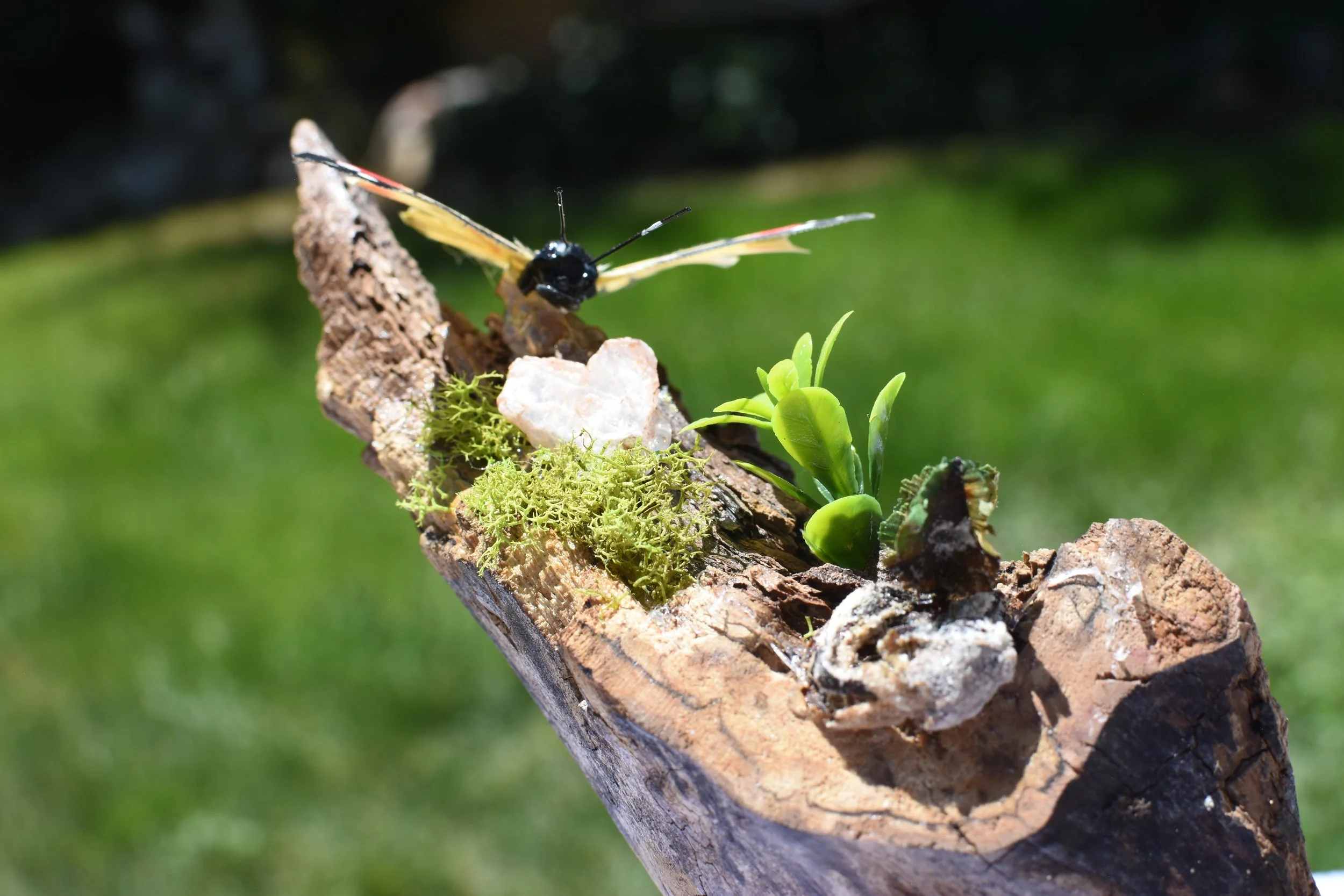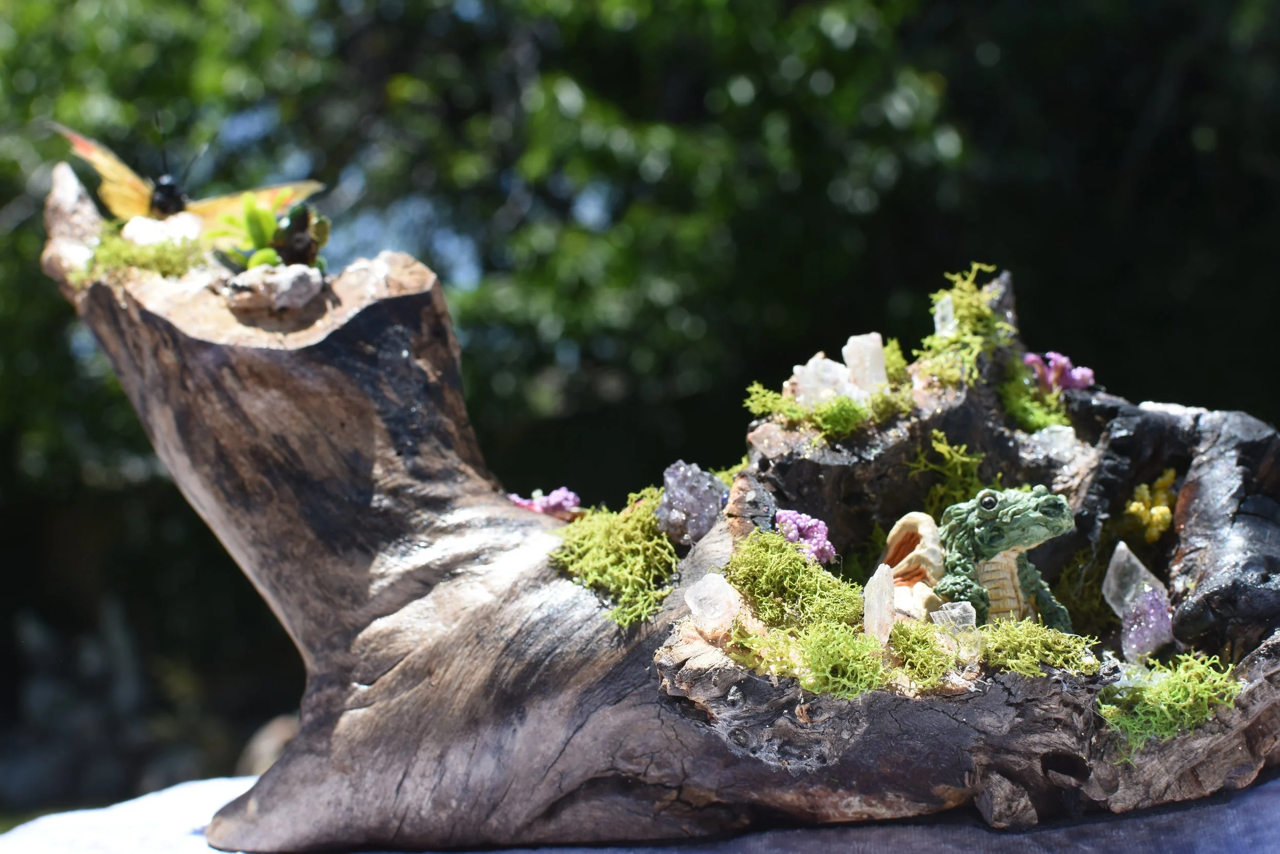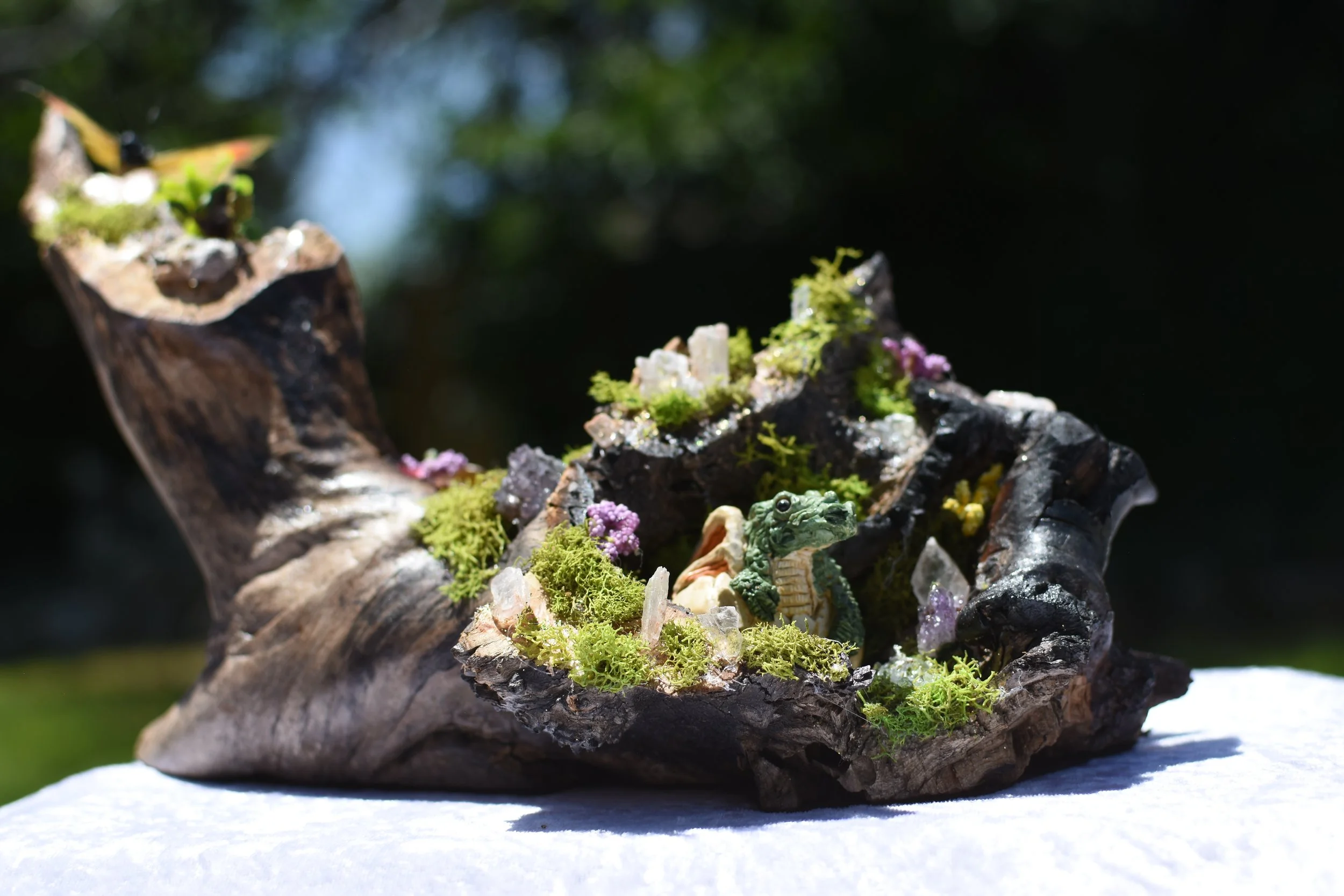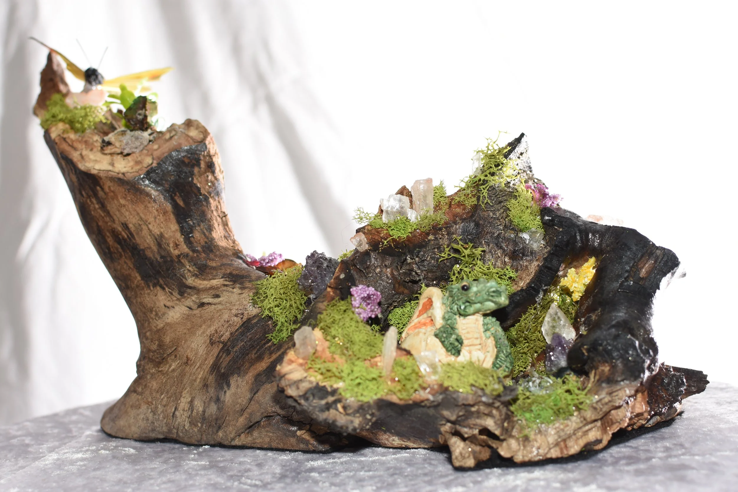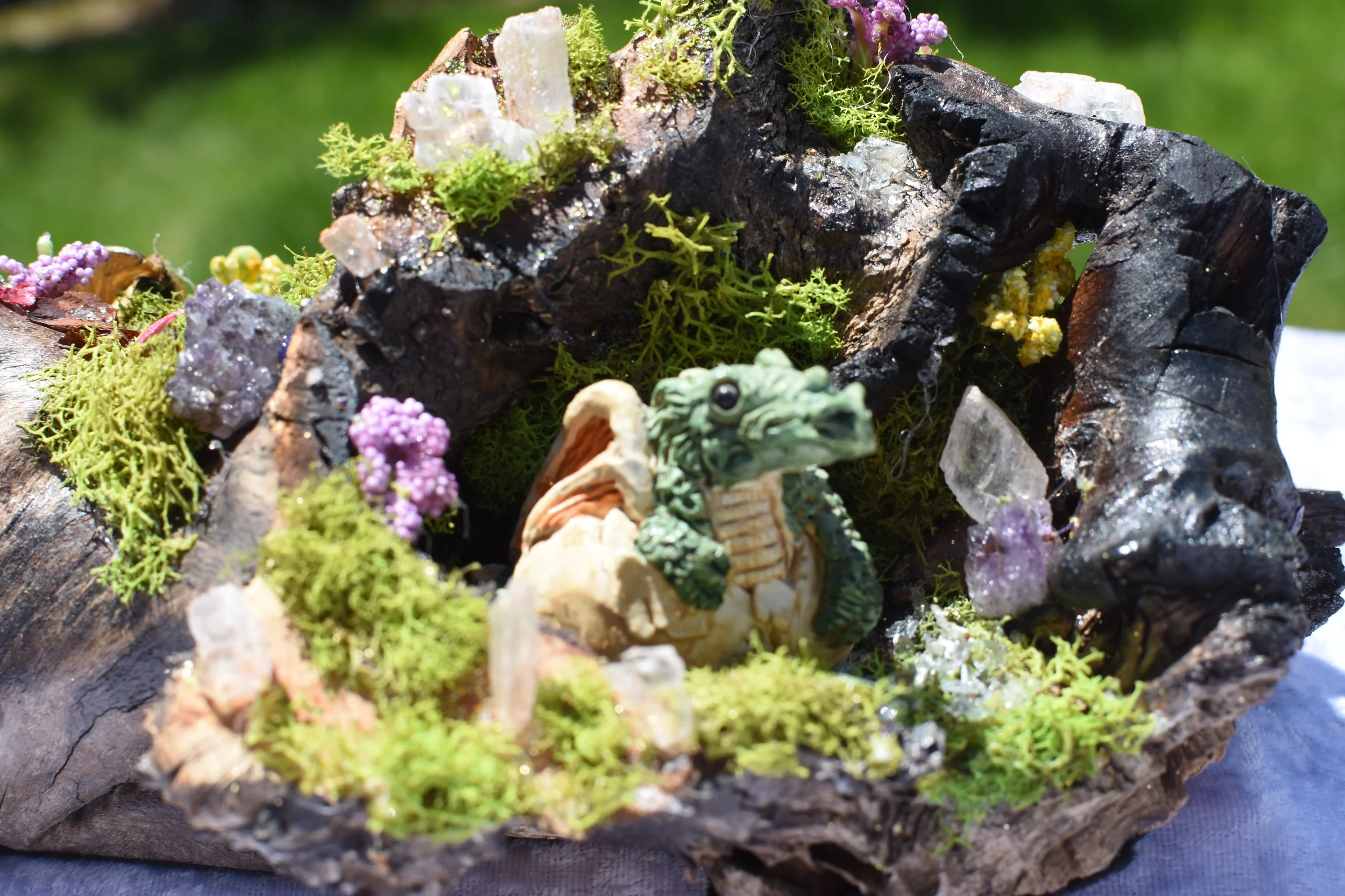 Deep in the woods, in a protected hollow, a baby green dragon has hatched. Surrounded by magical quartz, the dragon’s birth is overseen by a protective dragonfly.